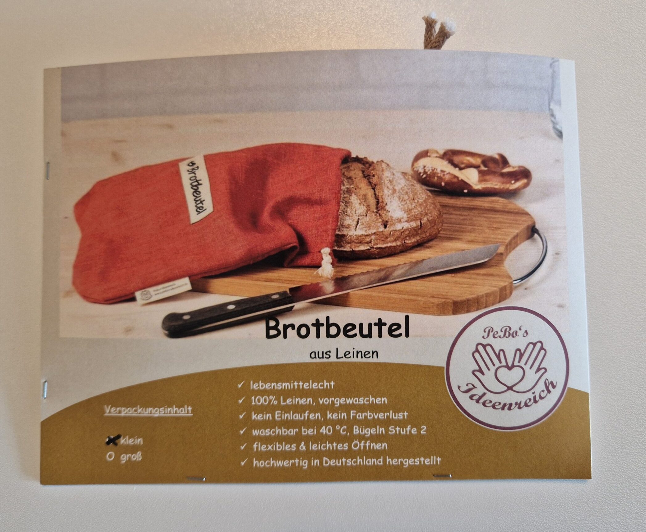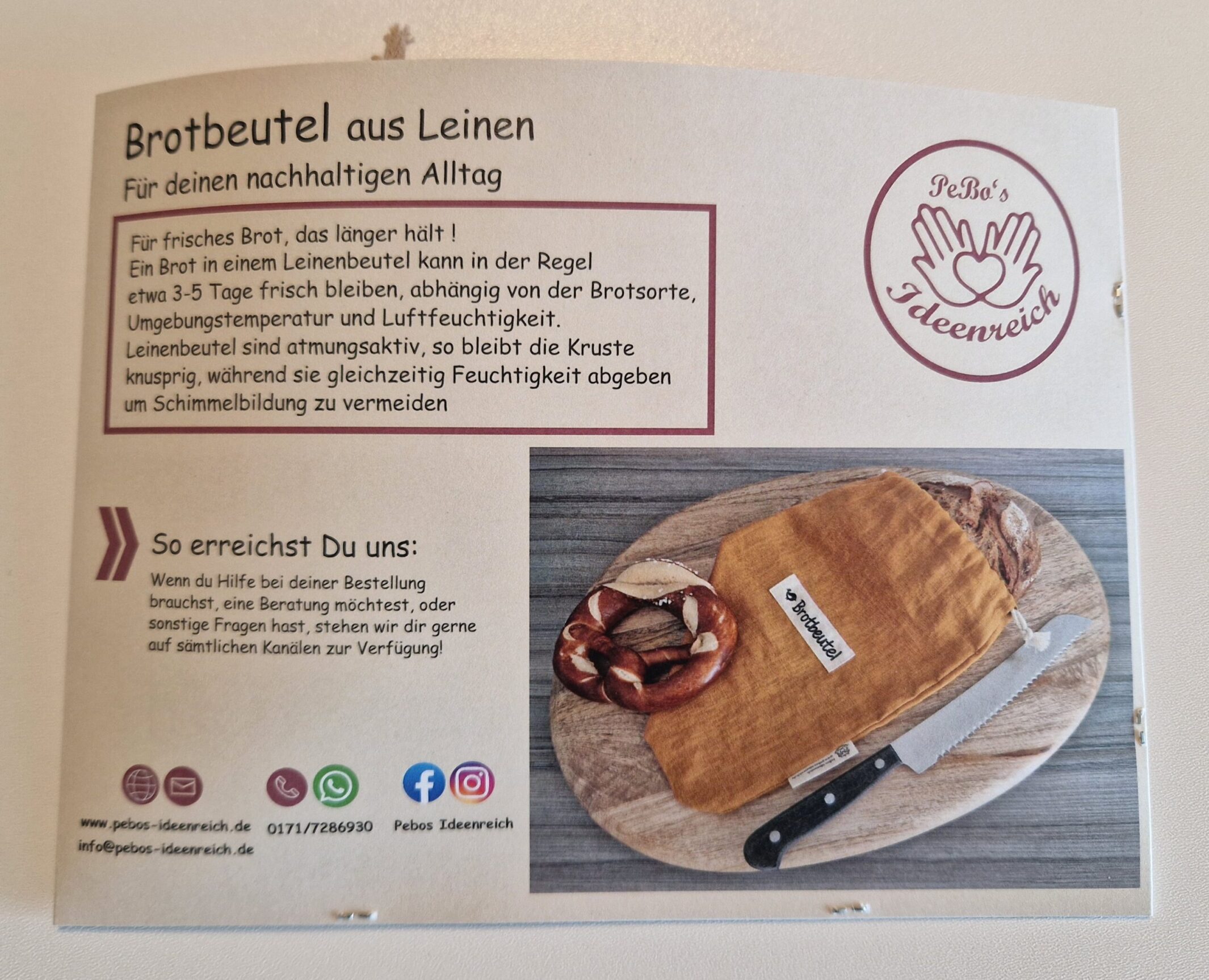Leinen Brotbeutel „groß“ 40 x 31cm Für frisches Brot, das länger hält ! Ein Brot in einem Leinenbeutel kann in der Regel etwa 3-5 Tage frisch bleiben, abhängig von der Brotsorte, Umgebungstemperatur und Luftfeuchtigkeit. Leinenbeutel sind atmungsaktiv, so bleibt die Kruste knusprig, während sie gleichzeitig Feuchtigkeit abgeben um Schimmelbildung zu vermeiden. √ lebensmittelecht √ zur Aufbewahrung von Brot und Gebäck √ für verpackungsfreien Einkauf beim Bäcker √ 100% Leinen √ vorgewaschen √ kein Einlaufen , kein Farbverlust √ waschbar bei 40 °C √ Bügeln Stufe 2 √ leicht & platzsparend √ flexibles & leichtes Öffnen √ hochwertig in Deutschland hergestellt √ erhältlich in 2 verschiedenen Größen