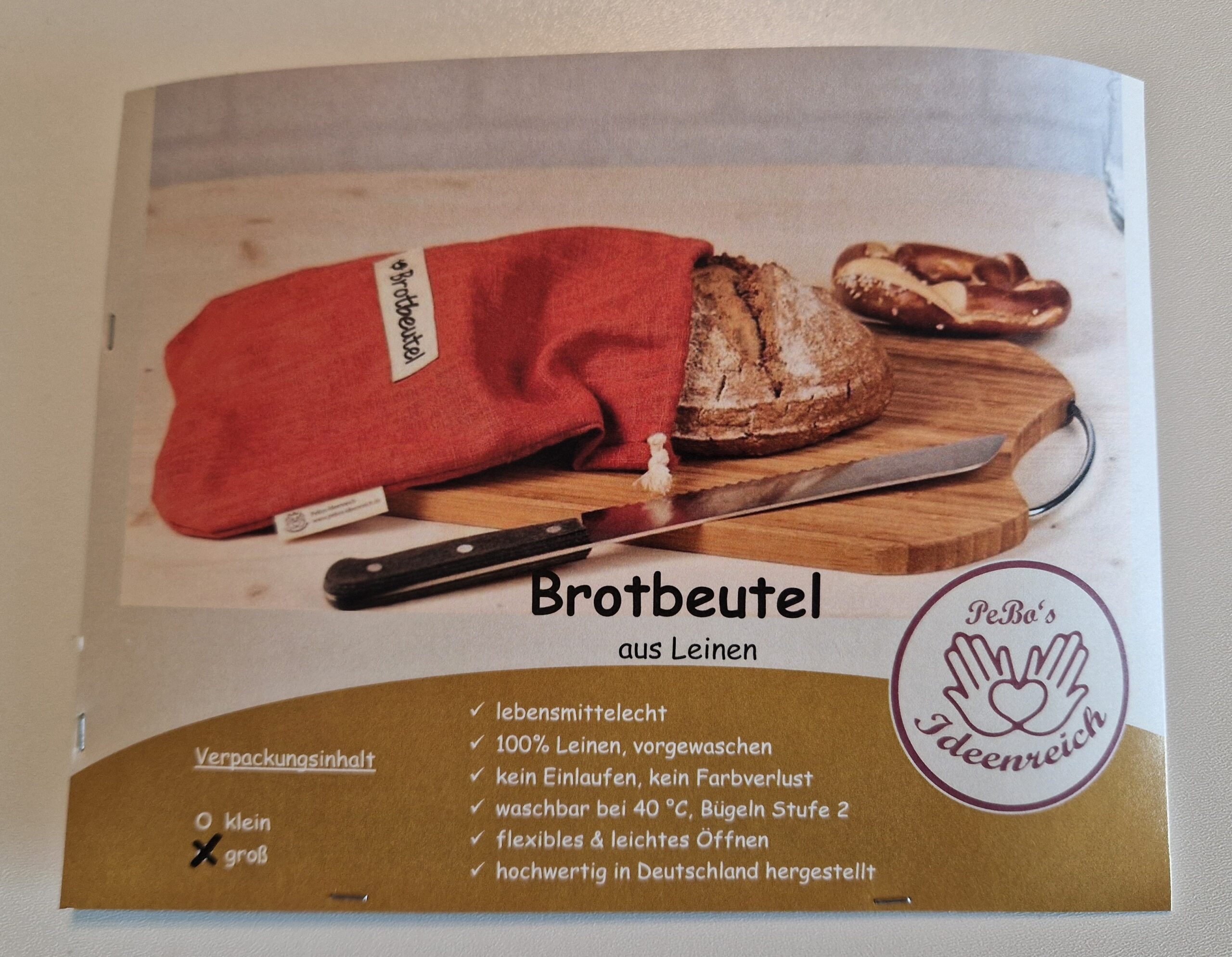 Leinen Brotbeutel „groß“ 40 x 31cm Für frisches Brot, das länger hält ! Ein Brot in einem Leinenbeutel kann in der Regel etwa 3-5 Tage frisch bleiben, abhängig von der Brotsorte, Umgebungstemperatur und Luftfeuchtigkeit. Leinenbeutel sind atmungsaktiv, so bleibt die Kruste knusprig, während sie gleichzeitig Feuchtigkeit abgeben um Schimmelbildung zu vermeiden. √ lebensmittelecht √ zur Aufbewahrung von Brot und Gebäck √ für verpackungsfreien Einkauf beim Bäcker √ 100% Leinen √ vorgewaschen √ kein Einlaufen , kein Farbverlust √ waschbar bei 40 °C √ Bügeln Stufe 2 √ leicht & platzsparend √ flexibles & leichtes Öffnen √ hochwertig in Deutschland hergestellt √ erhältlich in 2 verschiedenen Größen