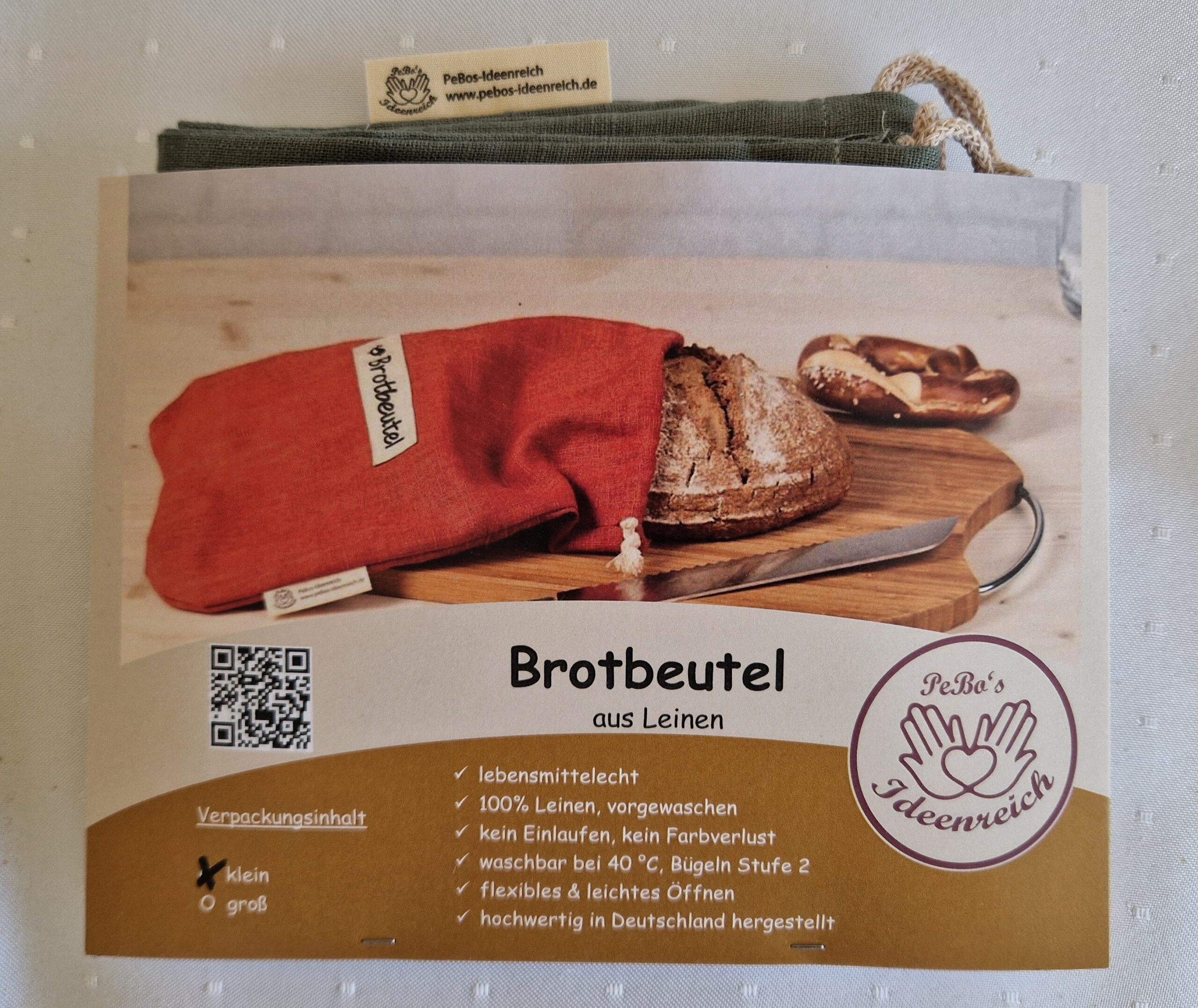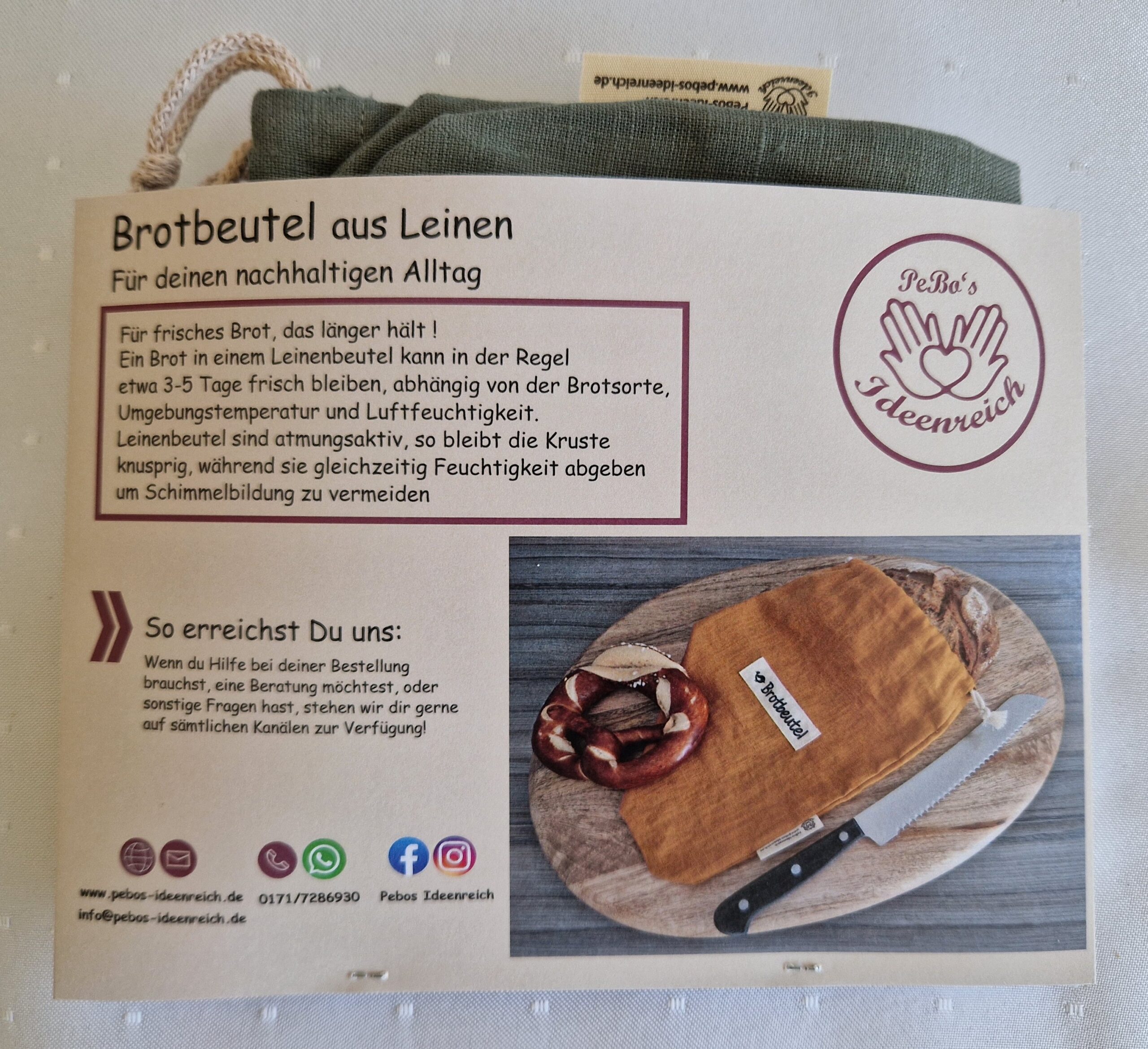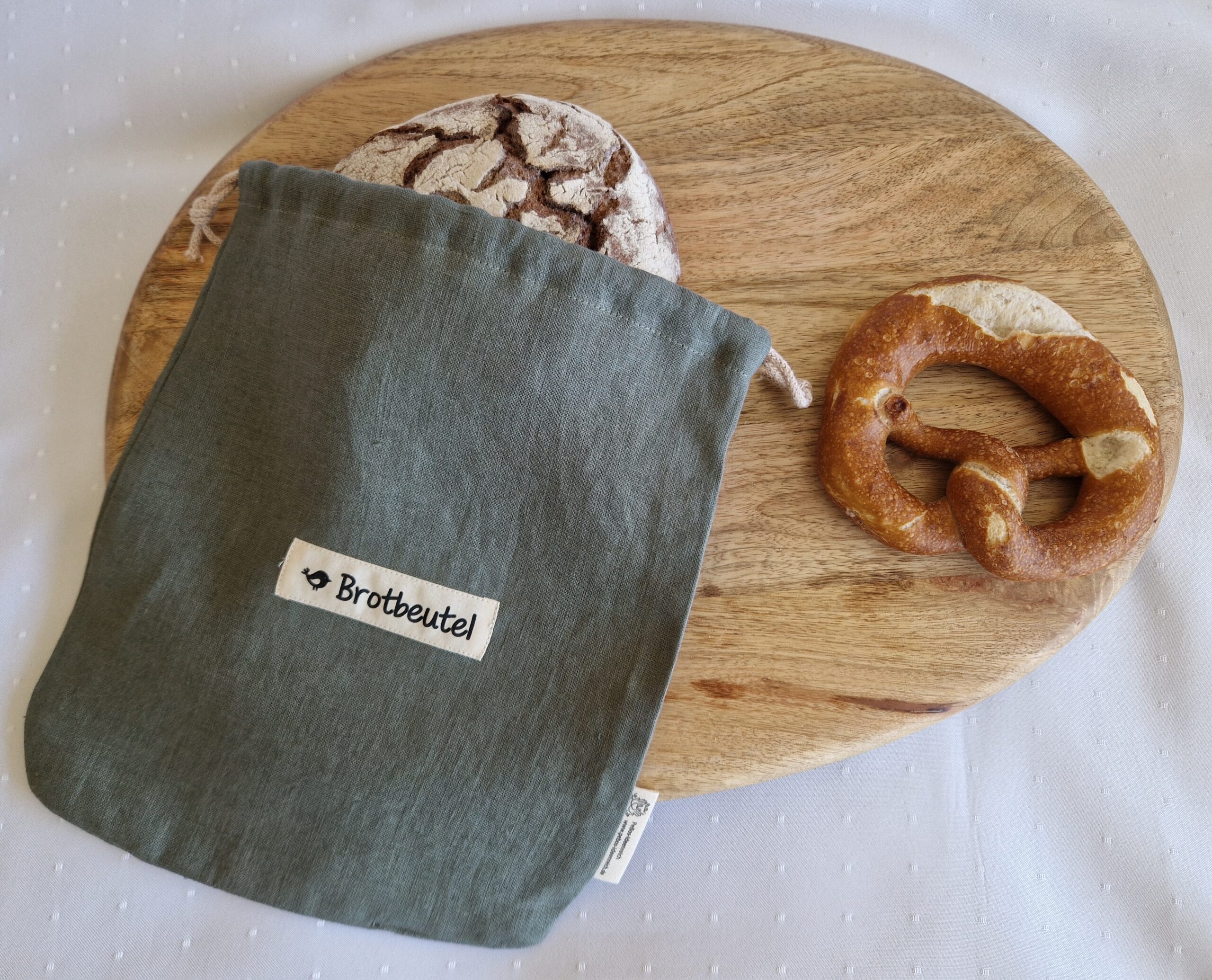 Leinen Brotbeutel „klein“ 31 x 22cm Für frisches Brot, das länger hält ! Ein Brot in einem Leinenbeutel kann in der Regel etwa 3-5 Tage frisch bleiben, abhängig von der Brotsorte, Umgebungstemperatur und Luftfeuchtigkeit. Leinenbeutel sind atmungsaktiv, so bleibt die Kruste knusprig, während sie gleichzeitig Feuchtigkeit abgeben um Schimmelbildung zu vermeiden. √ lebensmittelecht √ zur Aufbewahrung von Brot und Gebäck √ für verpackungsfreien Einkauf beim Bäcker √ 100% Leinen √ vorgewaschen √ kein Einlaufen , kein Farbverlust √ waschbar bei 40 °C √ Bügeln Stufe 2 √ leicht & platzsparend √ flexibles & leichtes Öffnen √ hochwertig in Deutschland hergestellt √ erhältlich in 2 verschiedenen Größen "Auf Anfrage auch als Brotsackerl erhältlich :-)"