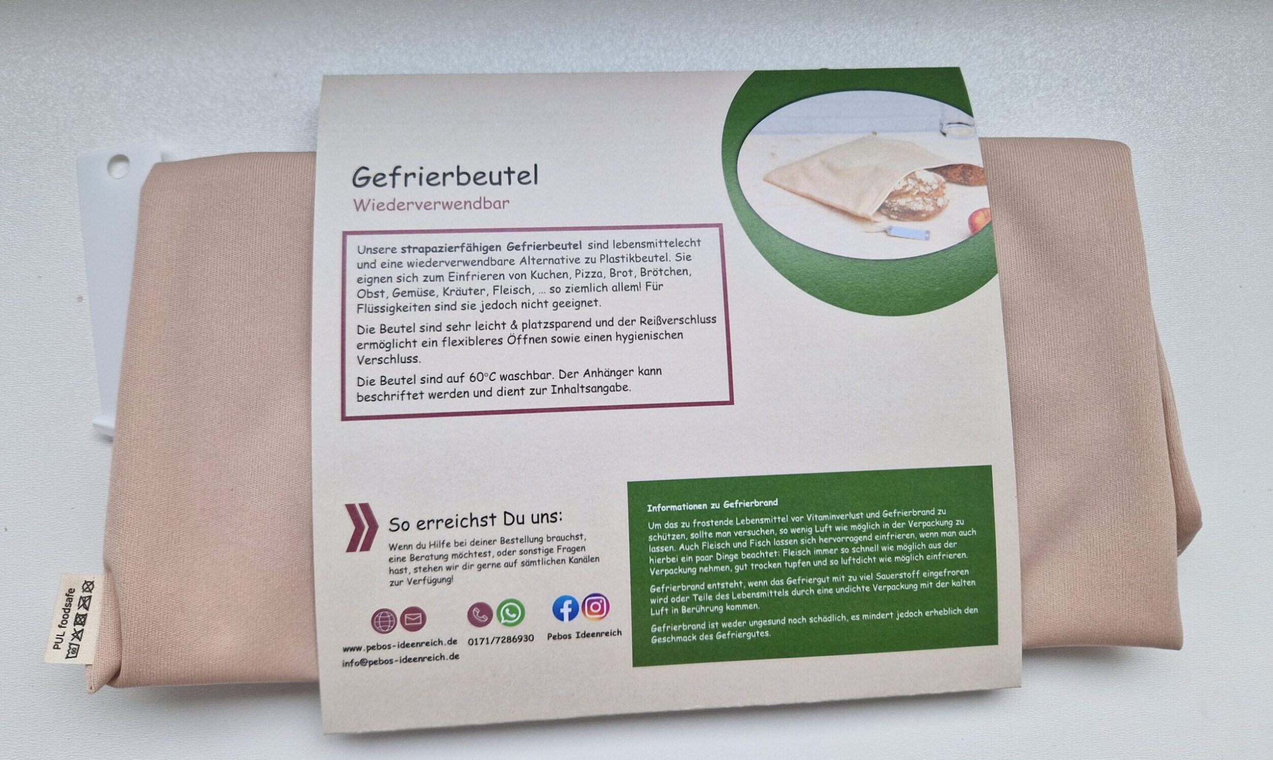Lebensmittel einfüllen, mit dem Reißverschluss oben schließen und einfrieren. Nach Gebrauch einfach mit in der Waschmaschine waschen und wieder verwenden.